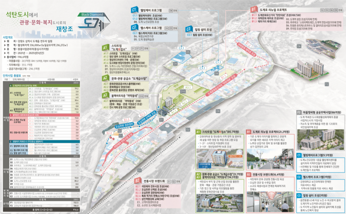 사업 주요내용은 경제기능회복에 ▲ 석탄산업 문화유산을 활용한 문화예술공간 조성 ▲ 청년·광부 창업교육 및 영상미디어센터 조성 ▲ 도계로 특화거리 조성 ▲ 전통시장 브랜드화 사업이 있다. 주민중심 생활복지 실현으로 ▲웰빙케어 프로그램 ▲ 헬스케어 프로그램 ▲ 힐링쉼터 등을 운영할 계획이다.