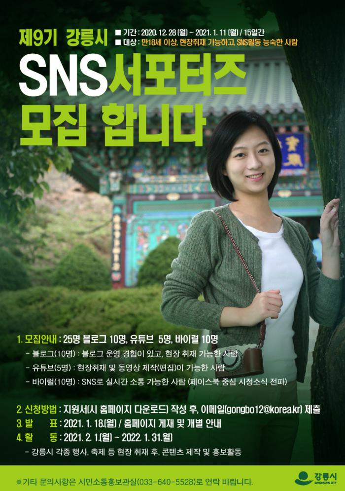 [시사투데이 김준 기자] 강릉시는 28일부터 다음달 11일까지 시 공식 SNS 콘텐츠 제작에 함께할 25명의 ‘제9기 강릉시 SNS서포터즈’를 모집한다.