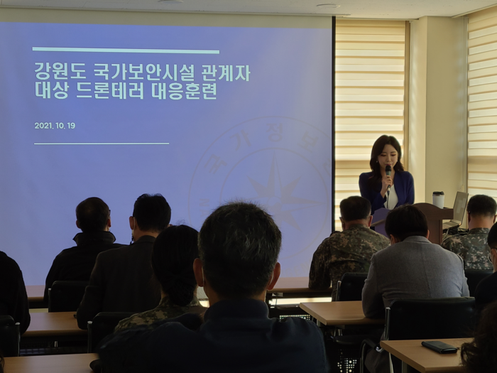 이번 훈련은 국정원 대테러 담당관의 드론테러·보안사고 사례 및 드론 대응지침 소개를 시작으로 항공안전기술원 강현우 미래항공연구실장의 ‘국내 드론산업 활성화를 위한 노력과 과제’ 제하 특강과 방산업체 LIG넥스원의 안티드론 장비 시연회, 참석기관 관계자들의 드론격추 실습 및 강원소방본부의 소방드론을 이용한 구조활동·2차 피해 대응 교육 등으로 진행됐다.