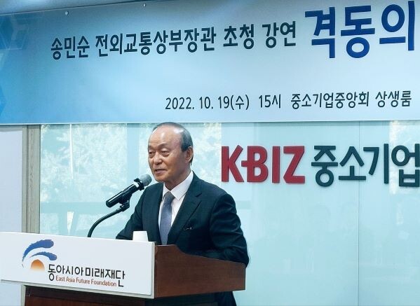 송 전 장관은 서울 영등포구 여의도 중소기업중앙회 상생룸에서 동아시아미래재단 주최로 열린 '격동의 세계와 한국의 길' 주제를 통해 세계 무역 금융 질서가 무너진 것과 관련 "미국이 이 늘 우리한테 강조하고 다른 나라에서 강조한 게 자유개방 무역이었고 자유개방구역 그래서 우리가 시장 개방 이야기 많이 들었다"며 "30년 전에 시장 개방 압력 쌀 시장 개방 같은 것도 마찬가지며, 여러 가지 이제 시장 개방감역 이런 걸 많이 하고 그랬다. 이게 미국이 이 자유 개방 구역을 하자. 이렇게 해서 했고 그걸 이제 유 조직이 된 게 세계무역기구 아니냐"라고 했다.