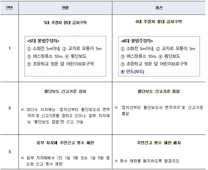 이번 개선을 통해 그동안 '소화전 5m 이내', '교차로 모퉁이 5m 이내', '버스정류소 10m 이내', '횡단보도', '초등학교 정문 앞 어린이 보호구역' 5대 구역으로 운영됐던 주정차 절대금지구역을 인도를 포함한 6대 구역으로 확대된다.