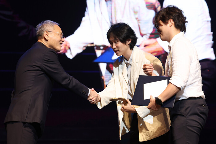 [시사투데이 이윤재 기자] 유인촌 문화체육관광부 장관이 23일 경기도 용인 수지구 포은아트홀에서 열린 대한민국 연극제 폐막식 '안녕, 용인!' 행사에 참석해 연극 '그때, 그들, 그 집'을 선보인 충청북도 극단 청사 대표에게 대한민국연극제 단체상 부문 금상인 문체부 장관 표창을 수여하고 있다.