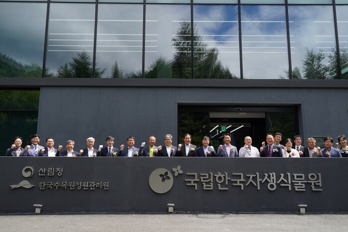 [시사투데이 이윤재 기자] 25일 강원도 평창군에서 열린 국립한국자생식물원 연구센터 준공식 및 개원식에서 임상섭 산림청장(왼쪽에서 아홉번째), 김창렬 기증자(왼쪽에서 여덟번째), 심재국 평창군수(왼쪽에서 열번째) 등 관계자들이 현판 제막을 마친 뒤 기념촬영을 하고 있다.<사진=산림청 제공>