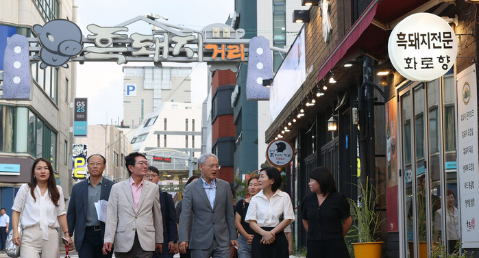 [시사투데 이윤재 기자] 유인촌 문화체육관광부 장관이 8일 제주 제주시 흑돼지 거리의 한 식당을 방문해 사장에게 제주산 흑돼지에 대한 설명을 듣고 있다.