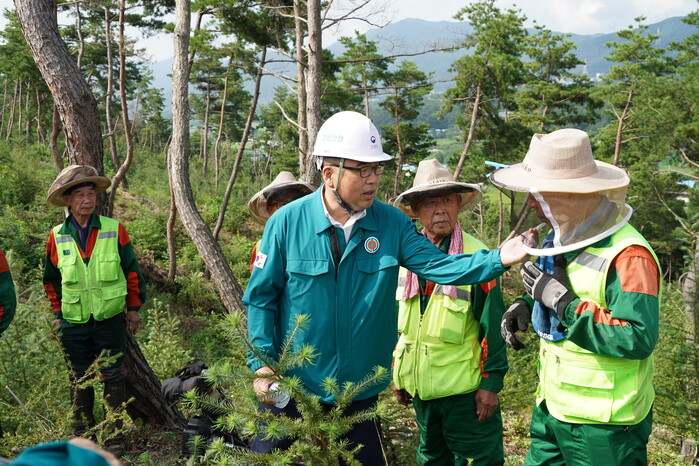 [시사투데이 이윤재 기자] 임상섭 산림청장이 16일 오전 경기도 포천시 신북면 일원 풀베기사업장을 찾아 작업자들을 격려한 뒤 안전사고에 각별한 주의를 당부하고 있다.<사진=산림청 제공>