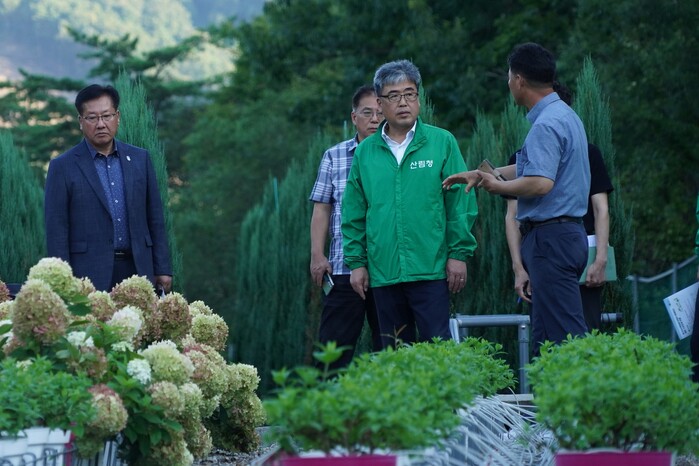[시사투데이 이윤재 기자] 임상섭 산림청장(가운데)이 28일 충청북도 청주시 상당구 조경수 재배 임가를 방문해 컨테이너 재배 시설을 둘러보고 있다.<사진=산림청 제공>