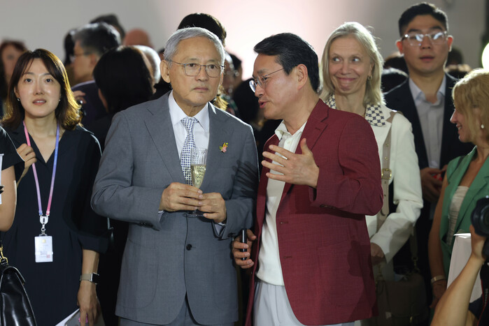 [시사투데이 이한별 기자] 유인촌 문화체육관광부 장관이 4일 서울 종로구 국립현대미술관 서울관에서 열린 대한민국 미술축제 ‘미술인의 밤’ 행사에서 조주완 LG전자 대표이사와 대화를 나누고 있다.