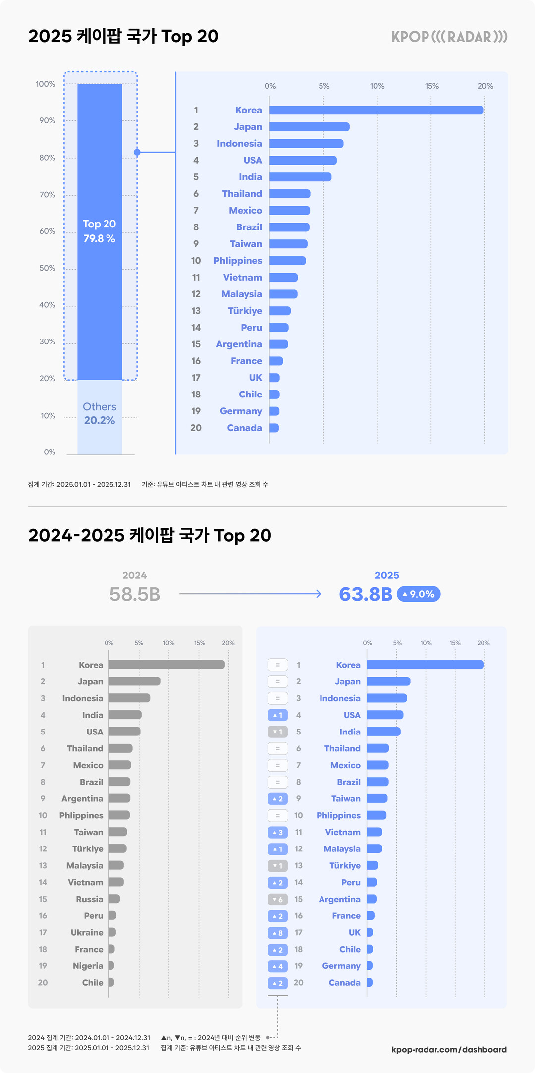 케이팝레이더는 2025년 1월 1일부터 12월 31일까지 유튜브 아티스트 차트 내 관련 영상 조회 수를 집계해 한 해 동안의 글로벌 케이팝 흐름을 분석했으며, 그 결과를 ‘2025 케이팝 세계지도’로 정리했다. 국가 편에서는 국가별 케이팝 소비 규모 및 아티스트 점유율, 성장률 변화를 통해 각 국가에서 가장 인기 있는 아티스트를 한눈에 보여준다.