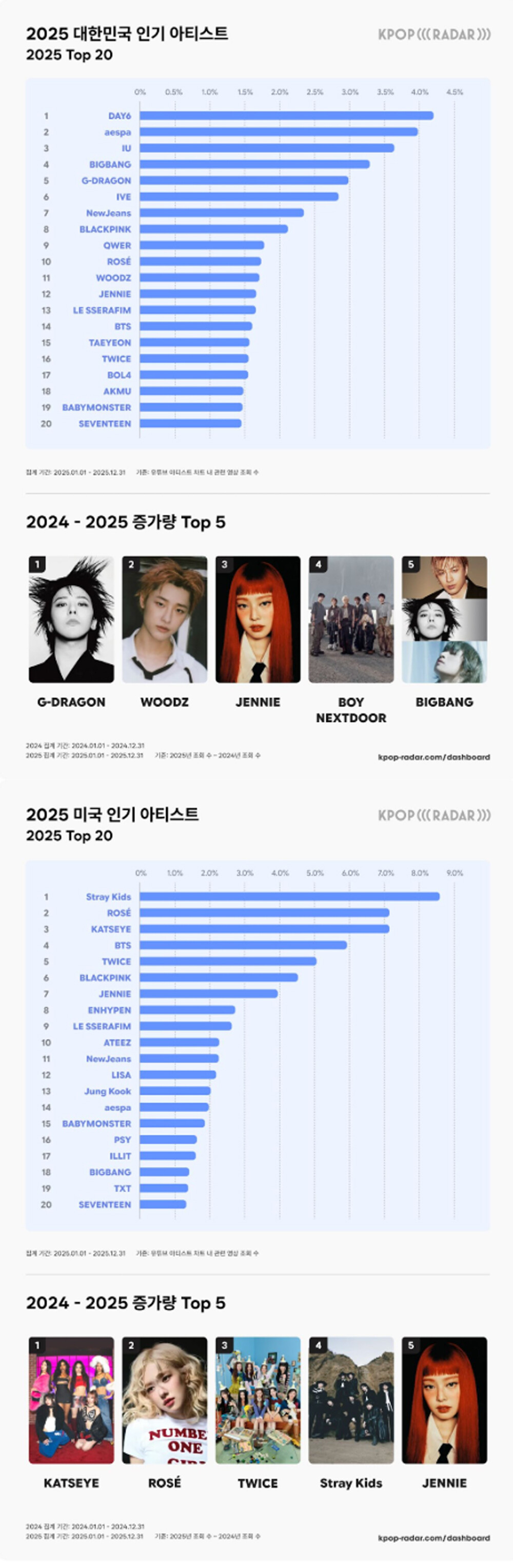 지드래곤은 약 2억 회의 조회 수 증가로 증가량 1위와 전체 5위에 올랐으며, 빅뱅 역시 전체 4위를 기록하며 국내 대중들을 강력하게 결집시켰다. 솔로 아티스트의 약진도 두드러졌다. 우즈는 약 1억 6천만 회의 조회 수 증가로 전체 11위, 증가량 2위를 기록했고, 제니는 전체 12위와 증가량 3위에 오르며 개인 브랜드 파워를 입증했다.