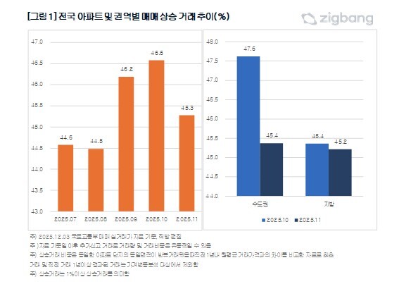 지방의 11월 상승거래 비중은 45.2%로 전월(45.4%) 대비 미세 조정을 보이며 비교적 안정적인 수준을 유지했다. 지역별로는 울산(49.2%), 전북(49.0%), 부산(47.5%), 대전(46.9%), 대구(45.7%) 등 순으로 상승거래 비중이 큰 것으로 집계됐다.