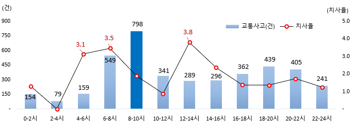 시간대별로는 기온이 낮고 출근길 교통량이 증가하는 오전 8시에서 10시 사이에 798건으로 가장 많았다. 치사율은 낮 12시에서 2시 사이가 3.8로 가장 높았다.