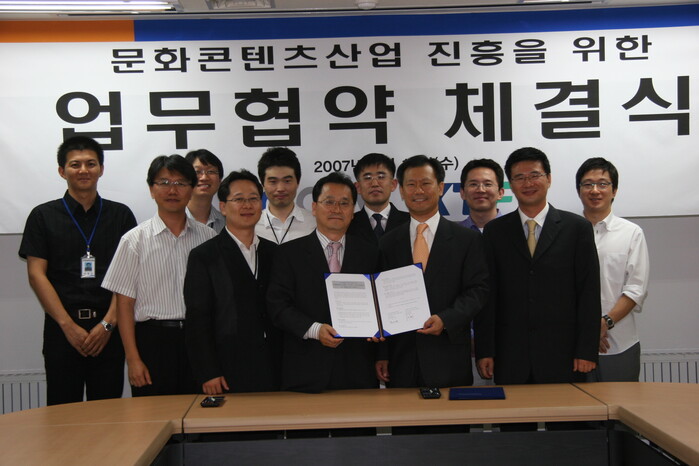 한국문화콘텐츠진흥원(원장 서병문)과 KTF(대표 조영주)는 18일 오전 11시 30분, 진흥원 2층 시사실서 국내 음악산업의 발전을 위해 새로운 콘텐츠와 신인발굴에 상호 협력 체계를 구축하는 협약식을 가졌다.