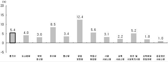 서비스업 생산은 오락·문화·운동관련 서비스업, 사업서비스업, 부동산 및 임대업 등에서 감소했으나 도·소매업, 기타공공수리 및 개인서비스업 등은 증가해 지난달 수준을 유지했고 전년동월과대비로는 금융 및 보험업, 운수업, 부동산 및 임대업 등을 중심으로 5.4% 증가했다.