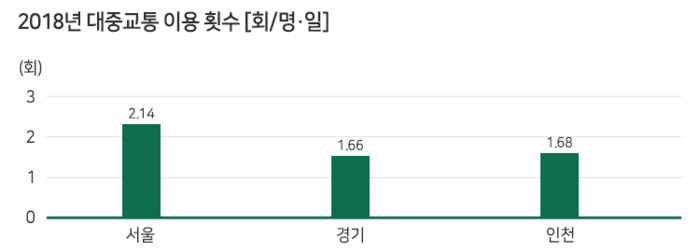 수도권 시민들이 대중교통 1회 이용에 지출한 금액은 평균 2,104원이었다. 지역 간 이동하는 경우 인천-경기 2,571원, 서울-인천 2,195원, 서울-경기 2,001원을 지출했다. 지역 내에서는 경기도 2,274원, 서울 1,391원, 인천 1,608원을 지출했다.