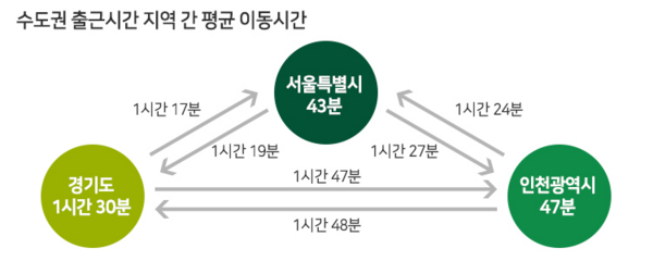 수도권에서 대중교통을 이용해 출근하는 경우 출발지에서 목적지까지는 평균 1시간 21분이 걸렸다. 인천-경기도 1시간 48분, 인천-서울 1시간 24분, 서울-경기 1시간 19분인 것으로 분석됐다. 지역 내에서는 서울 43분, 인천 47분, 경기 1시간30분이 걸렸다.
