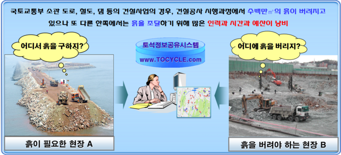 토석정보공유시스템은 공공 공사현장에서 발생하는 토석자원 정보를 등록 관리해 토석이 필요한 현장과 불필요한 현장을 연계함으로써 토석 구매, 폐기 비용 등의 예산을 절감하도록 2004년부터 구축돼 운영 중이다.