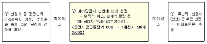국토부 측은 “예비당첨자가 대폭 확대되면 최초 당첨자가 계약을 포기할 경우 당첨되지 못한 1·2순위 내 ‘후순위’ 신청자가 계약할 기회를 갖게 돼 계약률도 높아지고 무순위 청약 물량도 최소화될 것으로 기대된다”고 했다.
