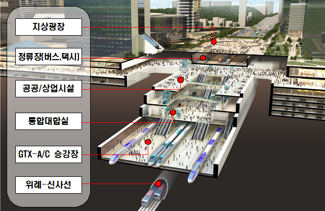 총 6개 층으로 복합 개발되는 강남권 광역복합환승센터는 지하 5층은 위례~신사선 도시철도, 지하 4층 GTX 승강장, 지하 2~3층은 통합대합실과 공공·상업시설, 지하1층은 택시·버스정류장과 지하철 2호선·9호선 그리고 지상에 광장이 들어선다.