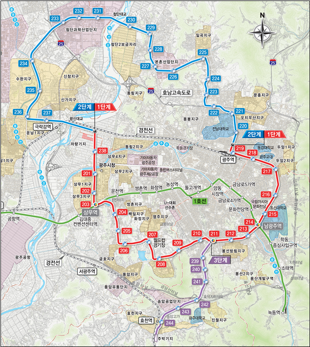 이번에 사업계획을 승인한 1단계 구간은 광주시청에서 월드컵경기장을 거쳐 광주역까지 약 17km를 연결한다. 2단계 구간은 광주역에서 전남대·수완지구를 거쳐 광주시청까지 20㎞를 연결해 1단계와 순환망을 이루게 된다. 3단계 구간은 백운광장에서 진월을 거쳐 효천역을 잇는 지선이다.