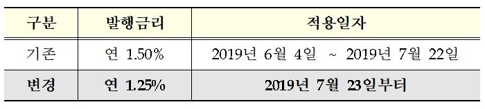 정부는 이번 발행금리 인하는 국민주택채권 유통금리가 지난해 말 1.98%, 올해 5월말 1.69%, 6월말 1.57%로 하락함에 따른 조치라고 밝혔다.