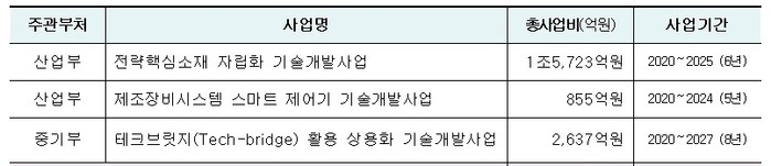 예비타당성조사 면제 추진 사업은 전략핵심소재 자립화 기술개발사업(1조 5,723억원, 2020~2025년(6년)), 제조장비시스템 스마트 제어기 기술개발사업(855억원, 2020~2024년(5년)), 테크브릿지 활용 상용화 기술 개발사업(2,637억원, 2020~2027년(8년)) 3개다.