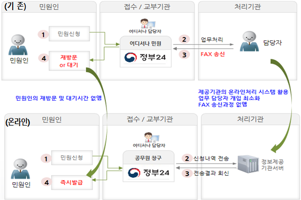 행안부는 제공기관의 온라인처리 시스템을 활용해 업무 담당자의 개입을 최소화하고 FAX 송신과정을 없애 즉시 발급이 가능하도록 했다.