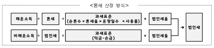 톤세는 해운기업의 소득을 해운소득과 비해운소득으로 구분된다. 해운소득에 대해 영업이익이 아닌 선박순톤수와 운항일수를 기준으로 산출한 선박표준이익을 토대로 법인세를 납부하는 제도다.