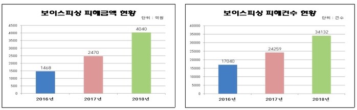 2016년부터 지난해까지 지난 3년간 보이스피싱 피해 금액은 7,978억원에 이른다. 지난해 피해 금액은 2016년과 비교해 275% 이상 증가했다. 피해 건수도 2016년 1만7,040건에서 2017년 2만4,259건, 지난해 3만4,132건으로 지속 증가하고 있다.