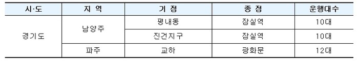 신설 노선 운행은 경기 남양주 평내동~잠실역과 진건지구~잠실역, 파주 교하~광화문이다. 특히 남양시주 평내동과 진건지구는 각각 올해 상반기 1,000여 세대, 말까지 3,000여 세대의 아파트가 입주할 예정으로 입주민들의 불편이 크게 해소될 것으로 전망된다.