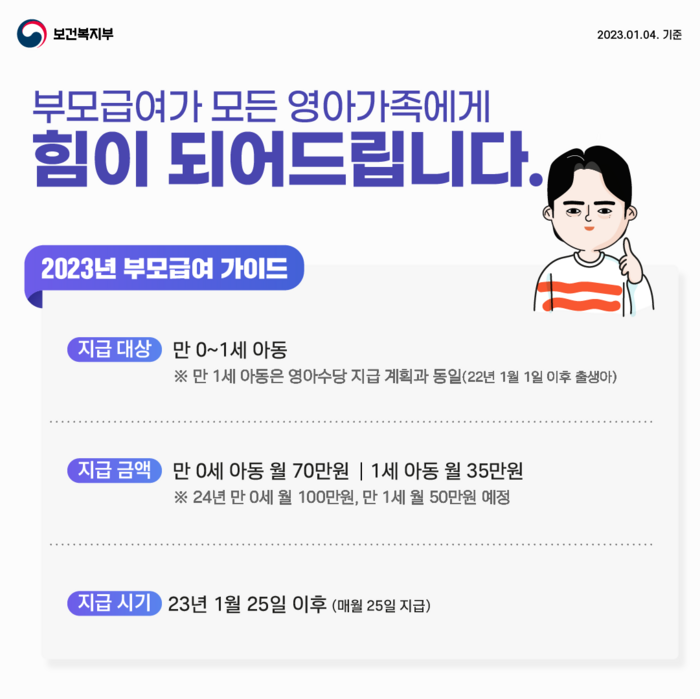 보건복지부는 올해부터 돌봄이 집중적으로 필요한 영아를 가정에서 맘 편히 돌볼 수 있도록 부모급여를 지원한다고 4일 밝혔다.