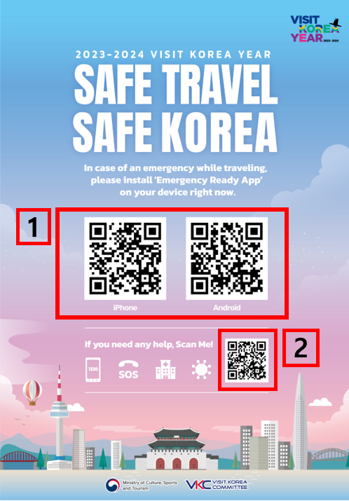 안전여행 홍보물에 있는 정보무늬(QR)를 스캔하면 ▴1330 관광 통역안내, ▴위급상황 발생 시 긴급 전화번호 안내, ▴코로나19 및 입국 절차 등을 영문, 일문, 중문 간체·번체로 지원한다.