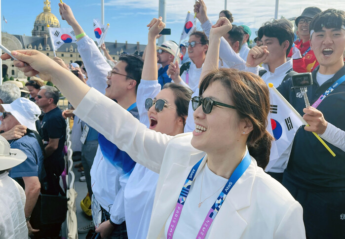[시사투데이 이윤재 기자] 장미란 문화체육관광부 제2차관이 28일(현지시간) 프랑스 파리 앵발리드 양궁장에서 열린 2024 파리올림픽 양궁 여자 단체 결승전에서 대한민국 선수단을 응원하고 있다.