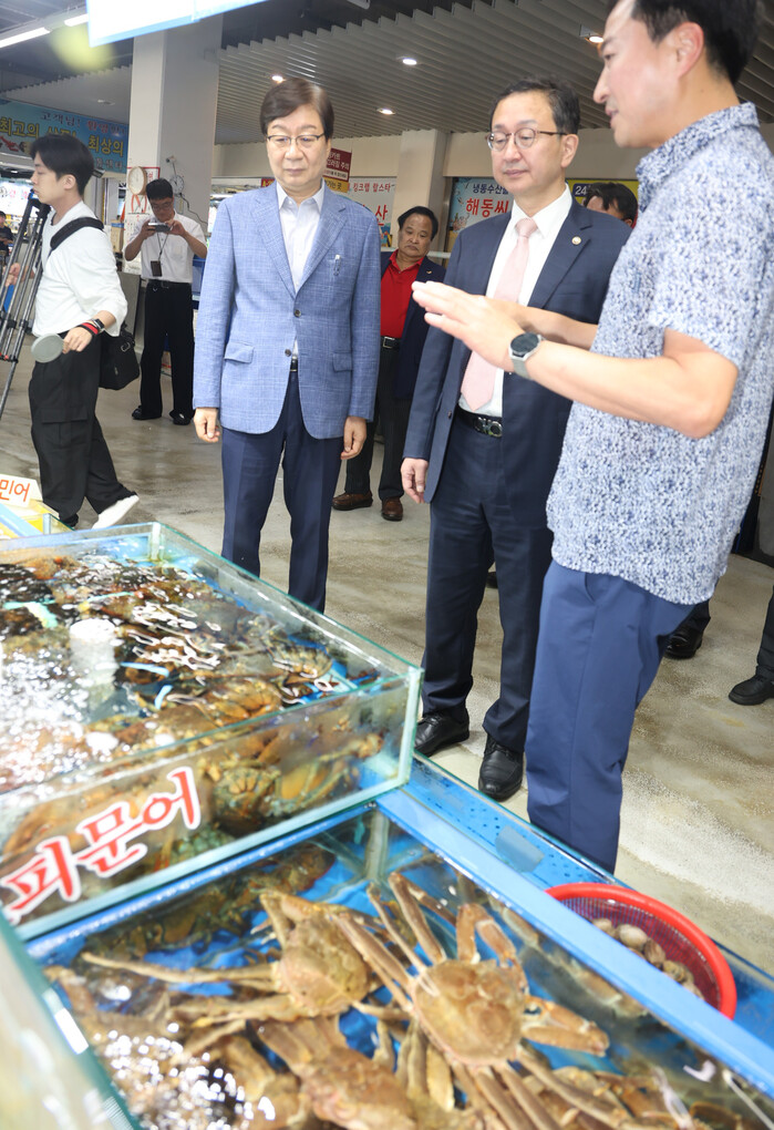 [시사투데이 이윤재 기자] 정승윤 국민권익위원회 부위원장이 31일 서울 송파구 가락농수산도매시장에서 상인들과 청탁금지법(일명 김영란법)상 농축수산물·가공품 선물의 평상시, 명절 기간 적정한 한도 금액에 대해 이야기 나누고 있다.