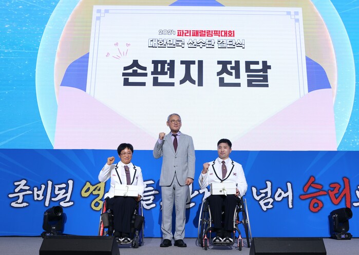 [시사투데이 이윤재 기자] 유인촌 문화체육관광부 장관이 12일 서울 송파구 서울올림픽파크텔에서 열린 2024 파리패럴림픽대회 대한민국 선수단 결단식에서 선수 대표에게 격려 손편지를 전달한 뒤 기념촬영을 하고 있다.