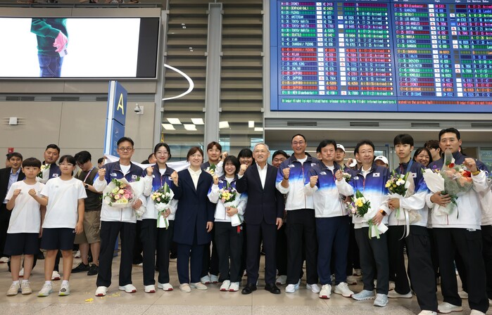 [시사투데이 이윤지 기자] 유인촌 문화체육관광부 장관이 13일 인천국제공항 제2터미널에서 입국장에서 열린 2024 파리올림픽대회 선수단 입국 환영행사에 참석해 선수단을 격려하고 기념촬영을 하고 있다.