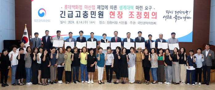 [시사투데이 이윤재 기자] 정승윤 국민권익위원회 부위원장 겸 사무처장이 14일 경남 창원시청에서 열린 롯데백화점 마산점 폐업 관련 고충민원 현장 조정회의를 마치고 옛 마산점 입점업체 종사자, 관계기관과 기념 촬영하고 있다.